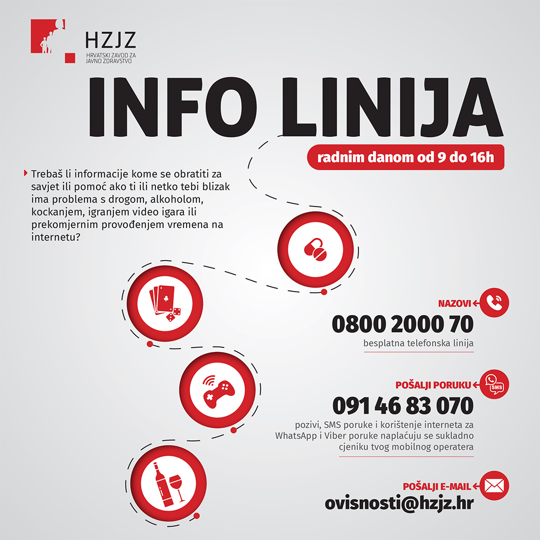 Pri Hrvatskom zavodu za javno zdravstvo djeluje Info linija za ovisnosti namijenjena pružanju informacija građanima kome se obratiti za savjet ili pomoć ukoliko oni ili netko njima blizak ima problem s drogom, alkoholom, kockanjem, igranjem video igara ili prekomjernim provođenjem vremena na internetu.