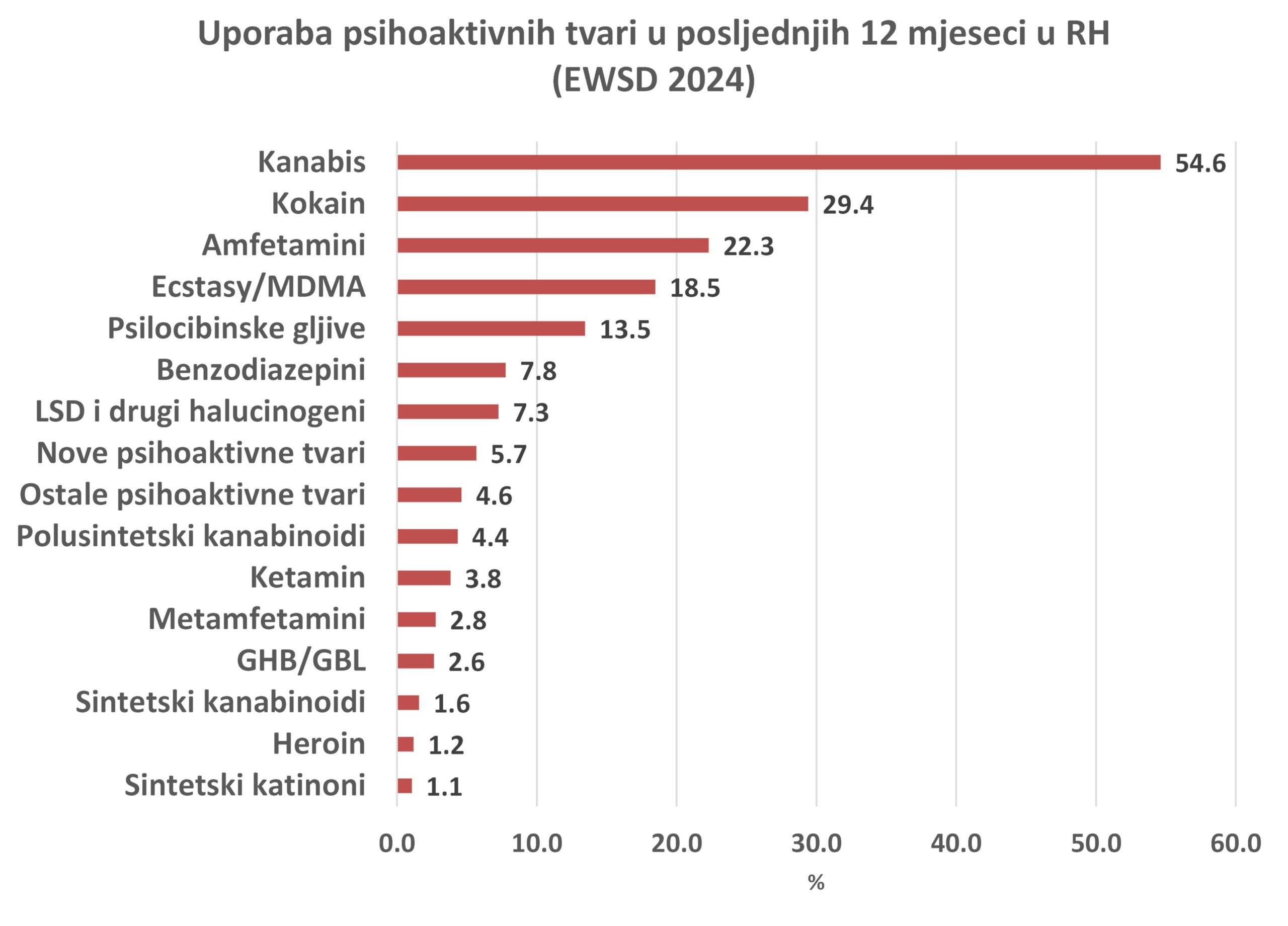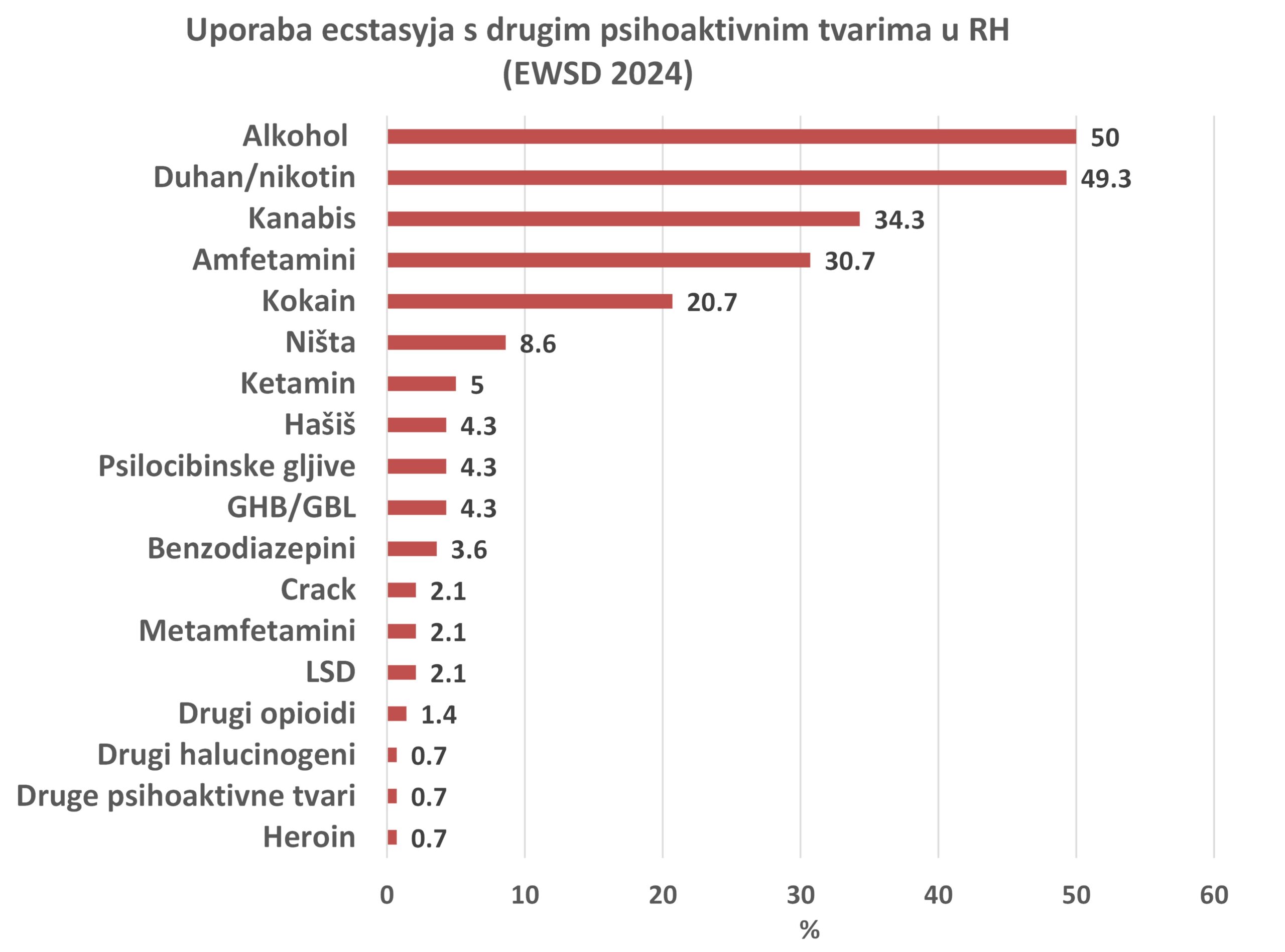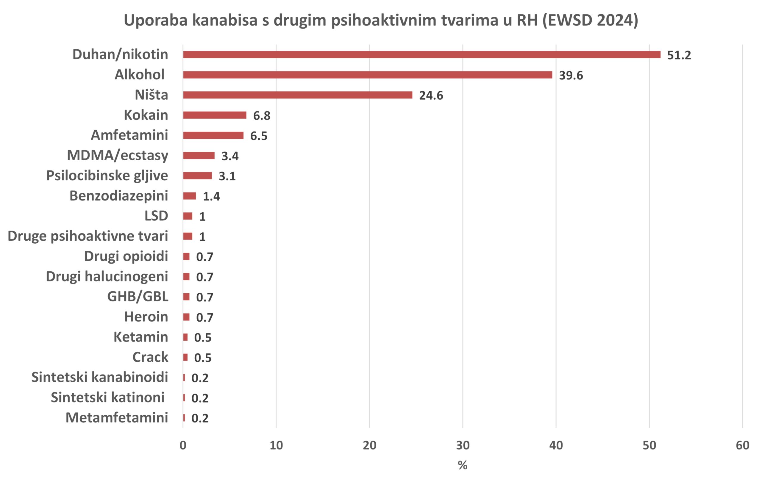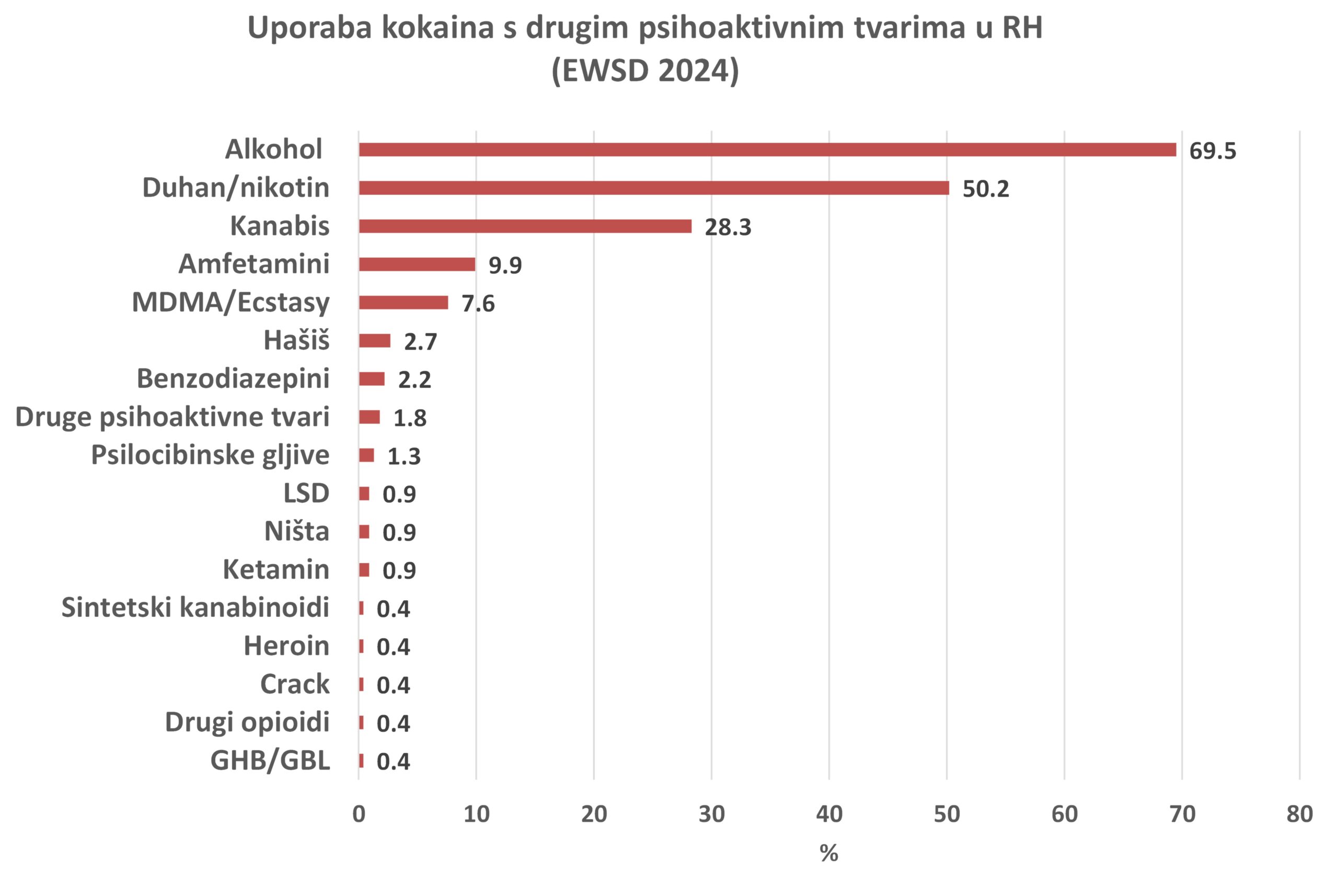 U posljednjem valu istraživanja provedenom 2024. godine u Hrvatskoj sudjelovalo je 758 ispitanika, od kojih je 72 % bilo u dobi od 18 do 34 godine. Rezultati istraživanja pokazuju da je u posljednjih 12 mjeseci od provedbe istraživanja u Hrvatskoj najviše sudionika koristilo kanabis (54,6 %), kokain (29,4 %), amfetamine (22,3 %) i ecstasy (18,5 %). Kada je riječ o uporabi više psihoaktivnih tvari, kanabis se najrjeđe koristi u kombinaciji s drugim supstancama, dok je kokain najčešće kombiniran s barem jednom tvari. Četvrtina korisnika kanabisa (24,6 %) izjavila je da ga konzumiraju bez drugih supstanci, dok je, s druge strane, 99,1 % korisnika kokaina odgovorilo da ga koriste u kombinaciji s drugim tvarima. Najčešća kombinacija uključuje kokain i alkohol (69,5 %), što može pojačati učinke obiju tvari, povećavajući time rizik od teških zdravstvenih i psiholoških posljedica.